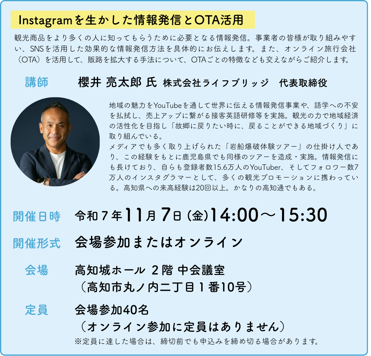 観光商品をより多くの人に知ってもらうために必要となる情報発信。事業者の皆様が取り組みやすい、SNSを活用した効果的な情報発信方法を具体的にお伝えします。また、オンライン旅行会社(OTA)を活用して、販路を拡大する手法について、OTAごとの特徴なども交えながらご紹介します。